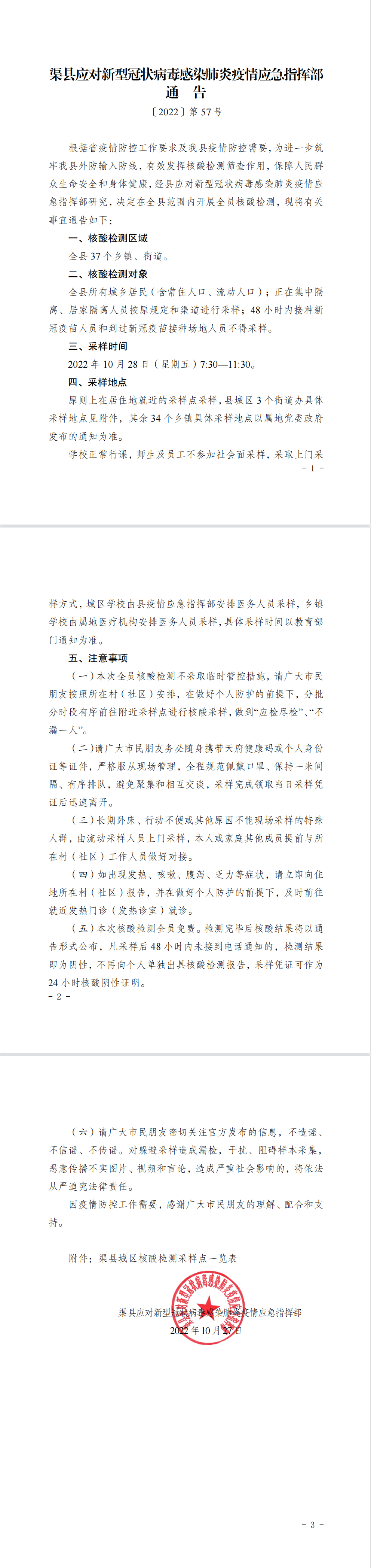 第57号!渠县疫情指挥部关于开展区域核酸检测的通告 字体:大 小 打印 关闭本页 作者:渠县融媒体中心 来源:本站原创 发布时间:2022-10-27 12:31:28 点击数: 扫一扫下载渠县网APP 分享 分享到: