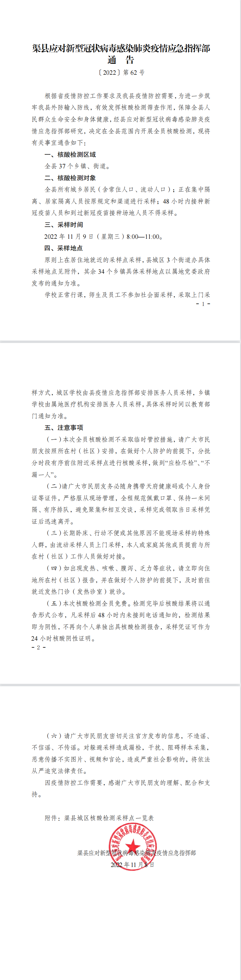 第62号!渠县疫情指挥部关于开展全员核酸检测的通告 字体:大 小 打印 关闭本页 作者:渠县融媒体中心 来源:本站原创 发布时间:2022-11-08 18:11:26 点击数: 扫一扫下载渠县网APP 分享 分享到: