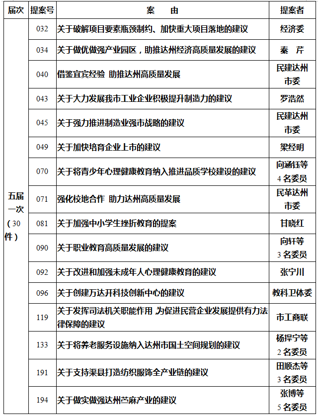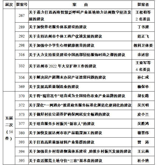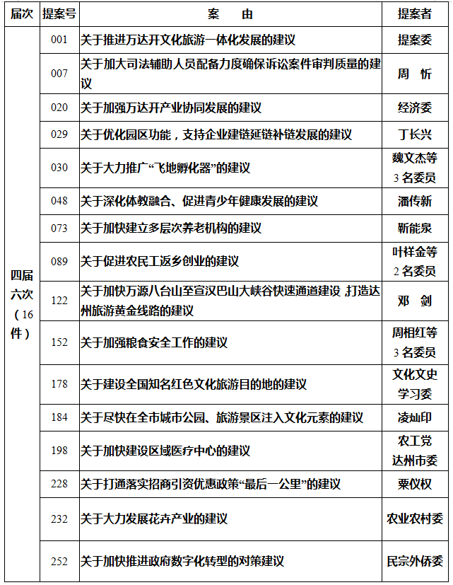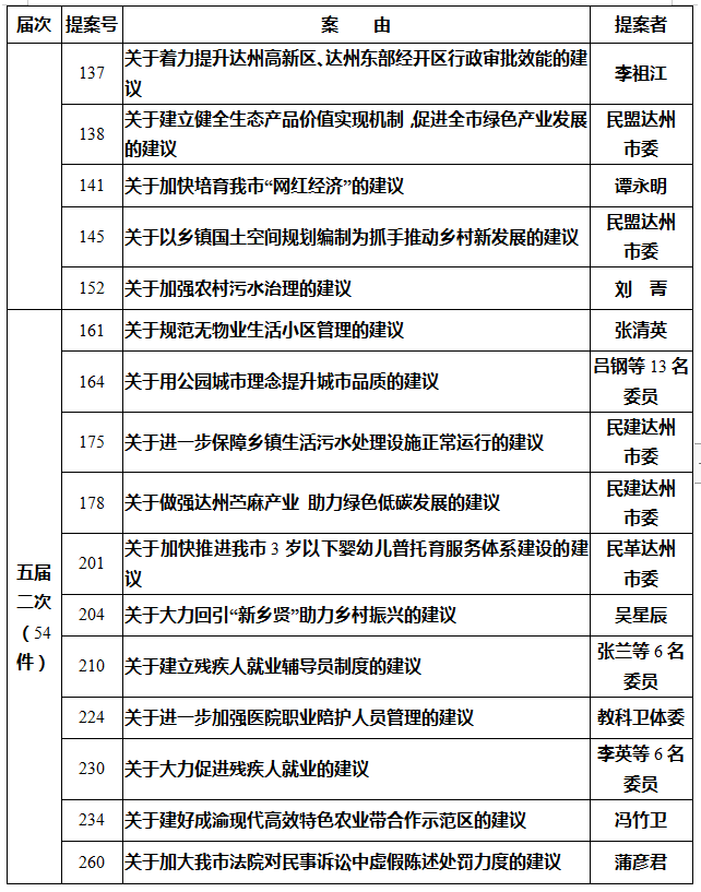 具体分析这些提案,内容涉及万达开统筹发展示范区建设、工业转型升级、乡村振兴、文旅融合、教育卫生、住房保障、粮食安全、生态文明建设等,其中民生及“热点”类提案占较大比重,如全国文明城市创建、职业教育与产业融合发展、创业就业、养老服务、物业管理、心理健康、政务服务和生态环境治理等。