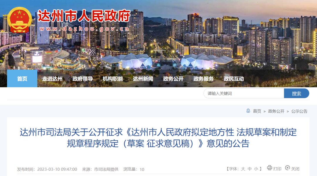 为深入推进科学立法、民主立法、依法立法,最大限度汇集民意、集中民智,提高立法质量,现将《达州市人民政府拟定地方性法规草案和制定规章程序规定(草案征求意见稿)》全文发布,征求社会各界意见,截止日期为2023年4月9日。