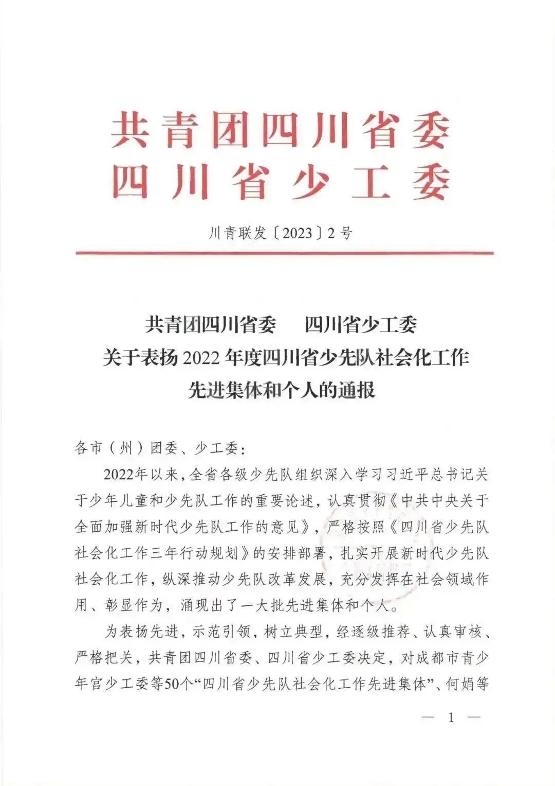 为表扬先进,示范引领,树立典型,经逐级推荐、认真审核、 严格把关,共青团四川省委、四川省少工委决定,对成都市青少年宫少工委等50个“四川省少先队社会化工作先进集体”、何娟等100名“四川省少先队社会化工作先进个人”予以表扬。
