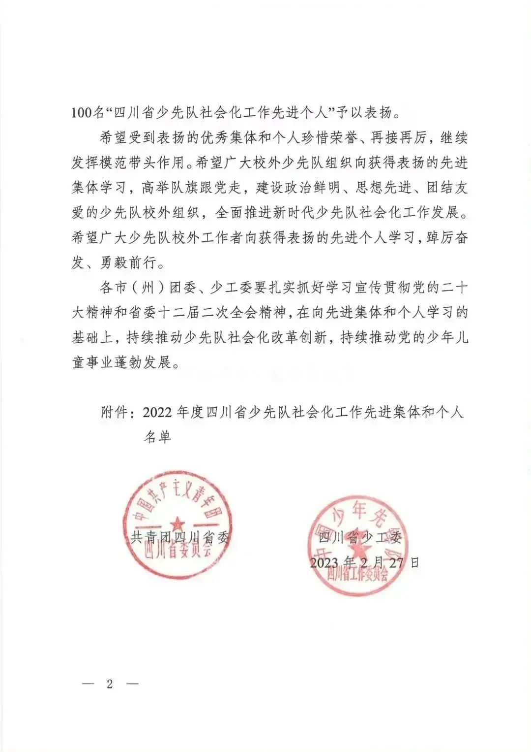关于表扬2022年度四川省少先队