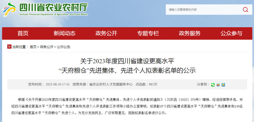根据《关于开展2023年度四川省建设更高水平“天府粮仓”先进集体、先进个人评选表彰的通知》(川农函〔2023〕379号)精神,经逐级推荐评选,并经四川省建设更高水平“天府粮仓”先进集体和先进个人评选表彰工作领导小组办公室审核,拟表彰97个四川省建设更高水平“天府粮仓”先进集体和199名四川省建设更高水平“天府粮仓”先进个人。为充分发扬民主,广泛听取意见,现就拟表彰名单进行公示。
