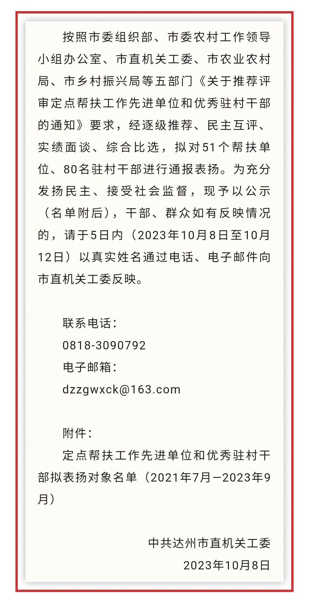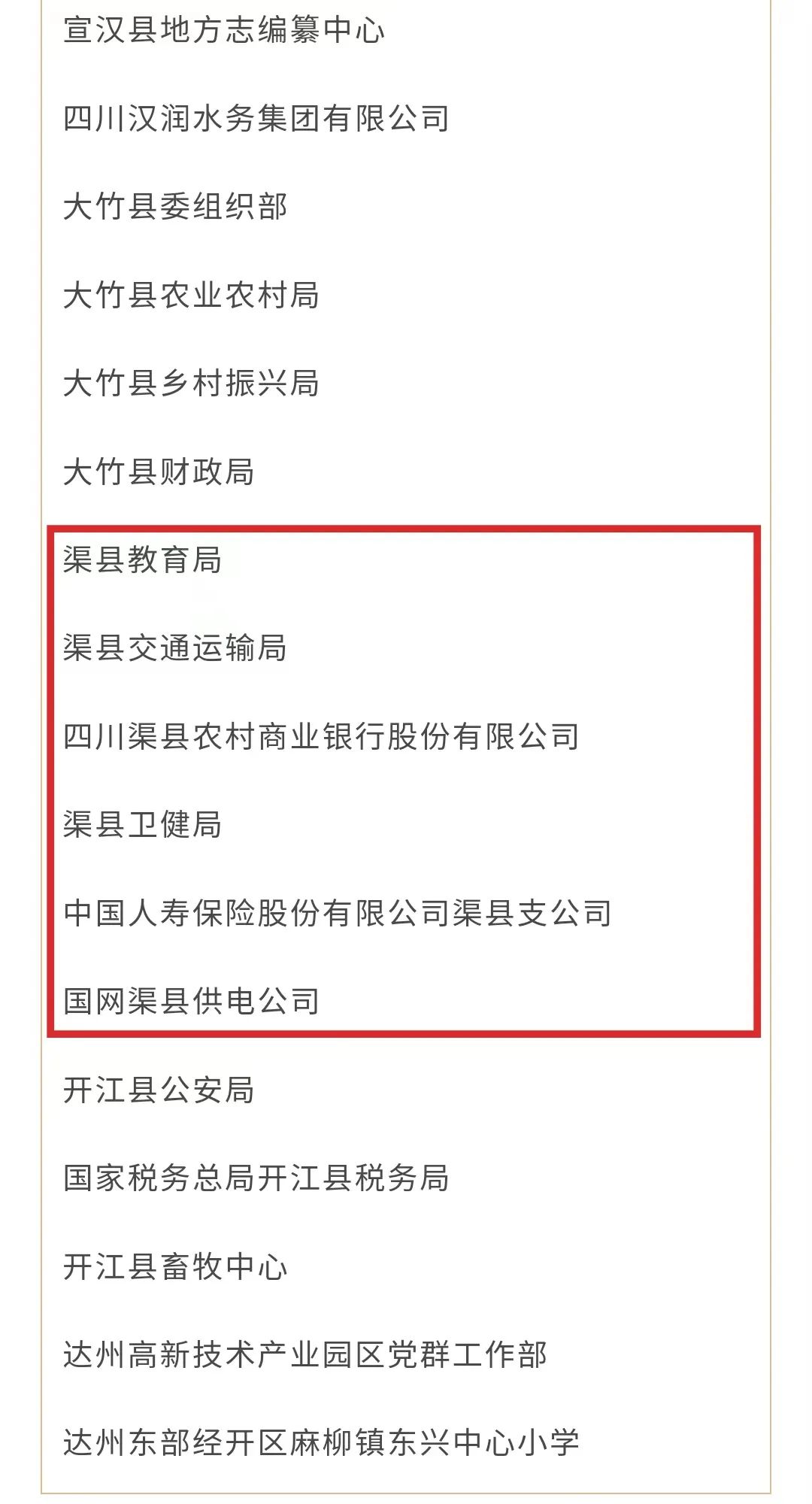 渠县9人6单位拟通报表扬!正在公示 字体:大 小 打印 关闭本页 作者: 来源:达州机关党建 发布时间:2023-10-10 12:35:00 点击数: 扫一扫下载渠县网APP 分享 分享到: 定点帮扶工作先进单位和优秀驻村干部拟表扬对象名单(2021年7月—2023年9月)