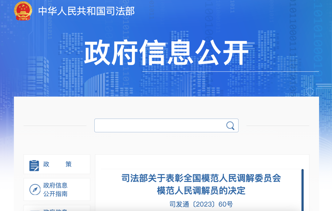 为表彰先进,激励士气,充分发挥先进典型的模范带动和示范引领作用,不断开创人民调解工作新局面,司法部决定授予北京市西城区什刹海街道人民调解委员会等299个人民调解委员会“全国模范人民调解委员会”称号;授予北京市海淀区羊坊店街道铁西社区人民调解委员会主任马文生等999名人民调解员“全国模范人民调解员”称号。