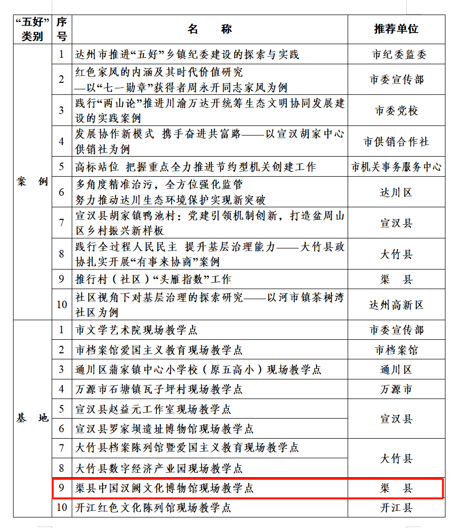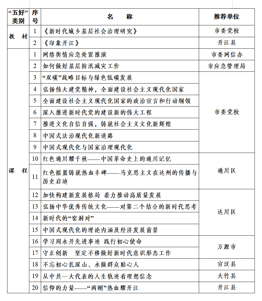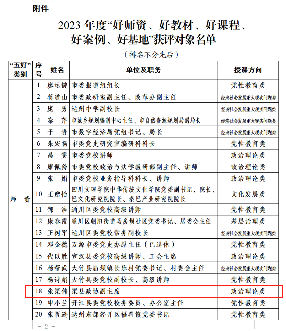 正在公示!渠县2个 字体:大 小 打印 关闭本页 作者: 来源:达州先锋 发布时间:2023-10-30 23:49:22 点击数: 扫一扫下载渠县网APP 分享 分享到: 日前中共达州市委组织部发布达州市2023年度“好师资、好教材、好课程、好案例、好基地”获评对象公示↓↓↓ 根据《关于做好2023 年度“好师资、好教材、好课程、好案例、好基地”推荐工作的通知》要求,近日组织评审专家对各地各部门申报的师资、教材、课程、案例、基地开展了评审,现对获评对象进行公示,公示时间3个工作日(10月27日至31日)。若有疑问请致电达州市委组织部干训科(联系电话:0818-3090653)进行咨询。2023年度“好师资、好教材、好课程、好案例、好基地”获评对象名单