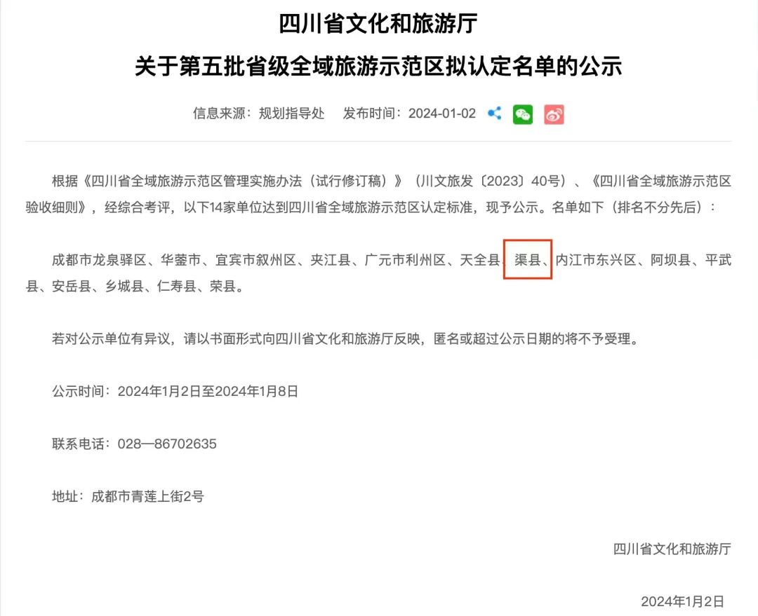 渠县入选第五批省级全域旅游示范区拟认定名单 字体:大 小 打印 关闭本页 作者: 来源:掌上达州 发布时间:2024-01-03 17:18:23 点击数: 扫一扫下载渠县网APP 分享 分享到: 1月2日,四川省文化和旅游厅公示第五批省级全域旅游示范区拟认定名单,渠县入选。根据《四川省文化和旅游厅关于第五批省级全域旅游示范区拟认定名单的公示》,成都市龙泉驿区、华蓥市、宜宾市叙州区、夹江县、广元市利州区、天全县、渠县、内江市东兴区、阿坝县、平武县、安岳县、乡城县、仁寿县、荣县14家单位达到四川省全域旅游示范区认定标准。