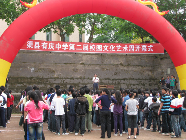 5月4日下午3点,有庆中学第二届校园文化艺术周在学校足球场隆重开幕。校长黄欣致了开幕词,他说:校园文化艺术周是学校文化的重要组成部分,是学校办学特色的呈现,是学校辐射社会的一个文化窗口,是全体师生魅力展示的一个平台。希望同学们积极主动地参与到活动中去,通过活动不断认识自我、挖掘潜能、提高自己。五彩缤纷的礼花将开幕式推向了高潮,也拉开了艺术周各项活动的序幕。