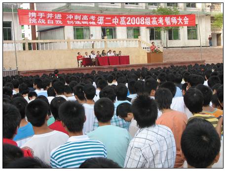 2007年9月17日,1300余名渠二中高三师生齐聚大操场,隆重举行了主题为“携手并进,冲刺高考;挑战自我,创造辉煌”的高2008级高考誓师大会。会议激发了师生斗志,打响了2008年高考的攻坚战。