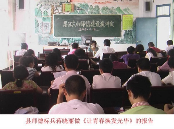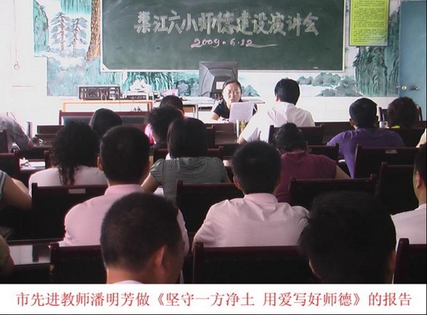 师德即教师的职业道德,是一种精神体现,一种深厚的知识内涵和文化品位的体现。师德需要培养,需要教育。在“2009师德建设年”活动中,渠江六小开展了一系列活动:学习《教师职业道德规范》,散发《师德建设倡议书》;评选“师德之星”;举办“文轩杯”师德演讲。在日常教育教学工作中,许多教师都在用自己的实际行动诠释着师德的真正内涵。