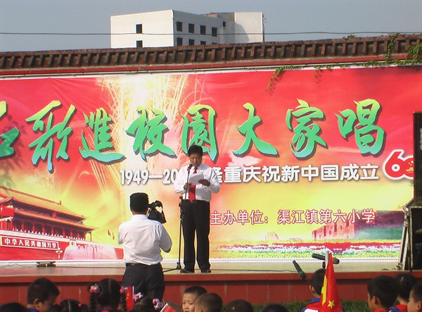 9月秋高气爽,渠江六小红旗招展。在新中国60华诞来临之际,29日下午,渠江六小师生欢聚一堂,隆重举行迎国庆大型红歌演唱会。