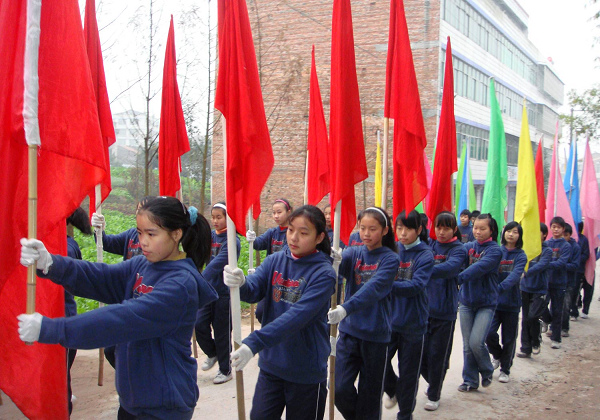 以各班为单位的代表队步履整齐地上街游行后,8:30,运动会入场式开始了,国旗护卫队、会标队、锣鼓队、彩旗队、14个代表队的近千余人参赛选手以饱满的姿态、矫健的步伐经过主席台,声声“强身健体、立志成材”、“团结拼搏、展现自我”的口号响彻校园。在鲜艳的五星红旗下,万兴贵校长发表了热情洋溢的致辞,运动员代表和裁判员代表庄重宣誓。