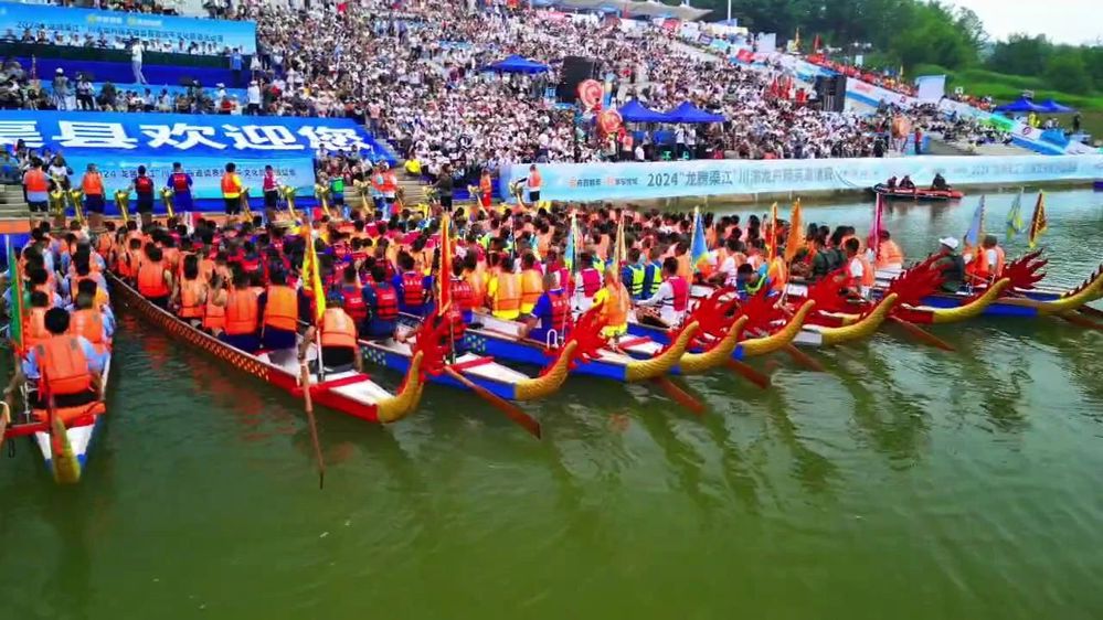 潮平岸阔,气势如虹;龙腾渠江,劈波斩浪。12支外地龙舟代表队争相上演速度与激情,在鼓点节奏中表达对龙年的祝愿,在桨船挥动中致敬龙舟文化,让爱国主义情怀激荡精神力量。