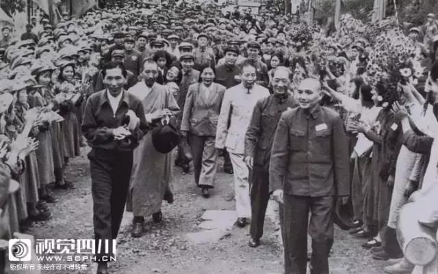1951年4月,邓小平和各界群众欢迎以阿沛阿旺晋美(前左一)为首的西藏地方政府代表团途经四川前往北京。(图片来源:四川日报历史资料)