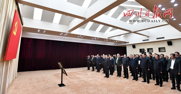 王东明在讲话中指出,党的十九大报告旗帜鲜明把不忘初心、牢记使命写入大会主题,指出中国共产党人的初心和使命,就是为中国人民谋幸福,为中华民族谋复兴。十九大胜利闭幕一周,习近平总书记带领中央政治局常委集体瞻仰中共一大会址和南湖嘉兴红船并发表重要讲话,重温入党誓词,充分展示了以习近平同志为核心的党中央时刻不忘初心、矢志永远奋斗的坚定决心,有力彰显了新一届中央领导集体为实现党的十九大提出的目标任务而奋斗的责任感和使命感。我们要认真学习贯彻习近平总书记重要讲话精神,在回顾党的光辉历程中学习革命先辈崇高精神,在重温入党誓词中强化党的意识、锤炼坚强党性,任何时候都不忘初心、牢记使命,在苦干实干中加快建设美丽繁荣和谐四川,奋力谱写中国梦四川篇章。