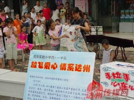 “同在一片蓝天下,面对大自然的灾害,面对达州即将辍学的小朋友,我们四·一班的小朋友决定为他们伸出援助之手。同时,也希望在场的爷爷奶奶、叔叔阿姨和小朋友献上一片爱心……” 这是8月27日成华实验小学四年级一中队,在学校附近的一个广场上开展“放飞爱心,情系达州”的义演义卖活动中李森涛同学的演讲词。