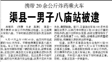 携带20余公斤炸药乘火车渠县一男子八庙火车站被逮 字体:大 小 打印 关闭本页 作者: 来源:本站原创 发布时间:2006-09-20 19:26:39 点击数: 扫一扫下载渠县网APP 分享 分享到: