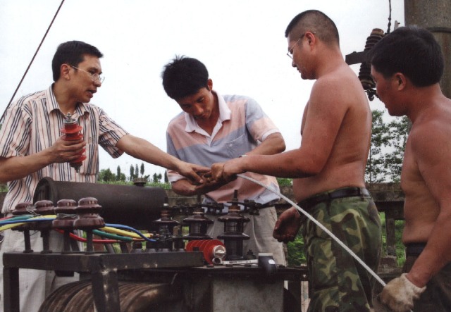 渠县天星镇56000人及时用上自来水 字体:大 小 打印 关闭本页 作者: 来源:本站原创 发布时间:2007-06-06 16:46:36 点击数: 扫一扫下载渠县网APP 分享 分享到: 渠县自来水公司天星水厂一级站变压器、配电设施,在5月30日下午被雷电击坏,造成渠江东岸天星镇机关、企事业单位、城乡居民等56000多人的生产、生活饮用水困难。县自来公司党政一班人高度重视,采取果断措施。公司分管领导庚即赶赴现场与水厂干部职工同心协力,冒着大雨更换变压器、抢修配电设施。连续奋战53个小时,于6月1日晚恢复供水。水厂干部职工还日以继认地继续战斗在抢险第一线。图为公司副经理陈芝林(左1)、水厂厂长代家坤(右3)及该厂职工抢修变压器的镜头。 (熊继泉)