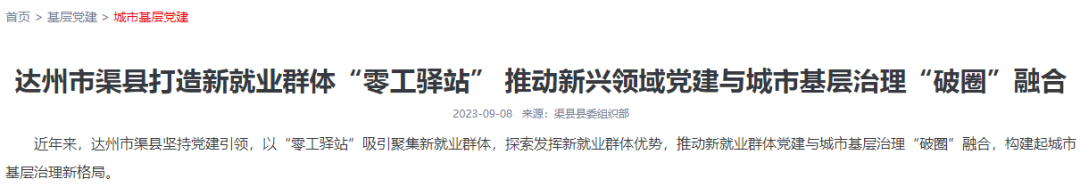 《四川党建网》点赞渠县:打造新就业群体“零工驿站” 推动新兴领域党建与城市基层治理“破圈”融合