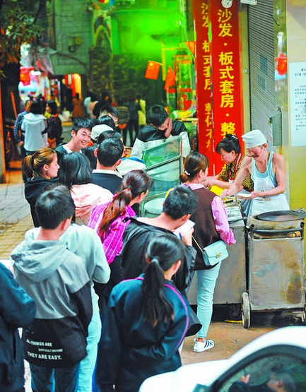下午3时许,渠县三中旁小巷内的锅盔“夫妻档”开始忙碌起来:戴着墨镜的郭吉富做锅盔,妻子张蓉在一旁切凉粉。小摊前排起了长长的队伍,直到傍晚7时收摊,两人才得空坐下歇息一会。