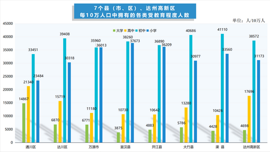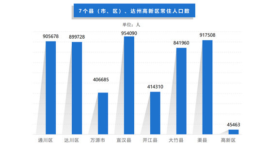 7个县(市、区)、达州高新区的常住人口中,超过90万人的有3个;80—90万人之间的有2个;少于80万人的有3个。常住人口最多的是宣汉县,常住人口最少的是达州高新区。