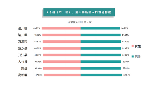 7个县(市、区)、达州高新区中,常住人口性别比在100至105之间的有2个,在105至110之间的有5个,超过110的有1个。