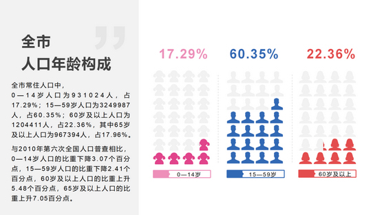 全市常住人口中,0—14岁人口为931024人,占17.29%;15—59岁人口为3249987人,占60.35%;60岁及以上人口为1204411人,占22.36%,其中65岁及以上人口为967394人,占17.96%。与2010年第六次全国人口普查相比,0—14岁人口的比重下降3.07个百分点,15—59岁人口的比重下降2.41个百分点,60岁及以上人口的比重上升5.48个百分点,65岁及以上人口的比重上升7.05百分点。
