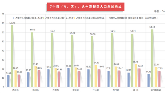 7个县(市、区)、达州高新区中,15—59岁人口比重在60%及以上有3个,在60%以下的有5个。除通川区外,其余县(市、区)65岁及以上老年人口比重超过14%的有7个。