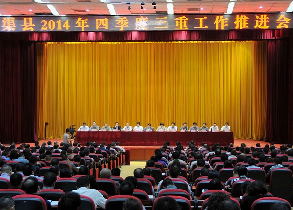 10月13日上午,我县2014年四季度“三重”工作推进大会在县会议中心召开,总结分析三季度“三重”工作及经济运行情况,安排部署四季度“三重”工作。县委书记王善平强调,要进一步明确任务、坚定信心、增添措施、强力推进,确保圆满完成全年各项目标任务。县委副书记、县长苟小莉通报了前三季度“三重”工作完成情况,客观分析了我县经济运行形势。县人大常委会主任何世斌、县政协主席许平等领导出席会议。
