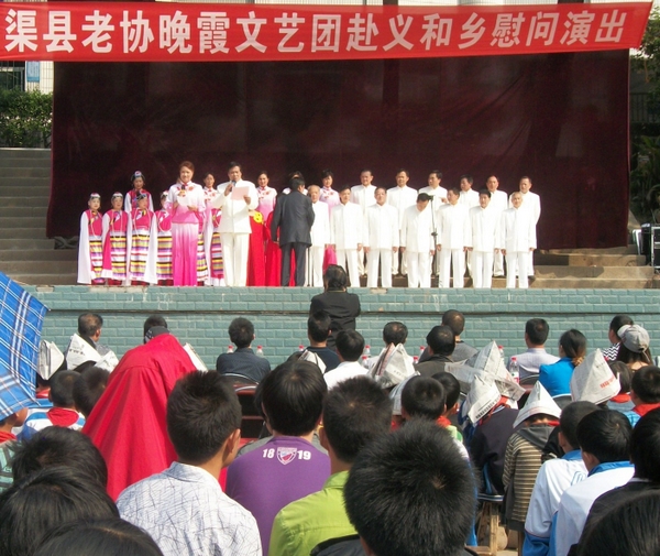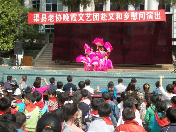 4月17日上午,义和乡中心小学操场人头攒动,彩旗飘扬,渠县“晚霞文艺团”来到革命老区--义和乡慰问演出。来自义和乡、柏水乡、大义乡、平昌县佛楼镇等乡镇的近千群众观看演出。