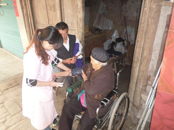 在吴茂翠老人家中,服务队人员拿着医疗器材,仔细地为她检查身体,听心脏好不好,量血压高不高等。从吴茂翠老人家出来,她们又来到了闫洪德老人家中,大家围坐在一起陪老太太聊天解闷,帮她理发、量血压、测血糖,老人非常高兴。