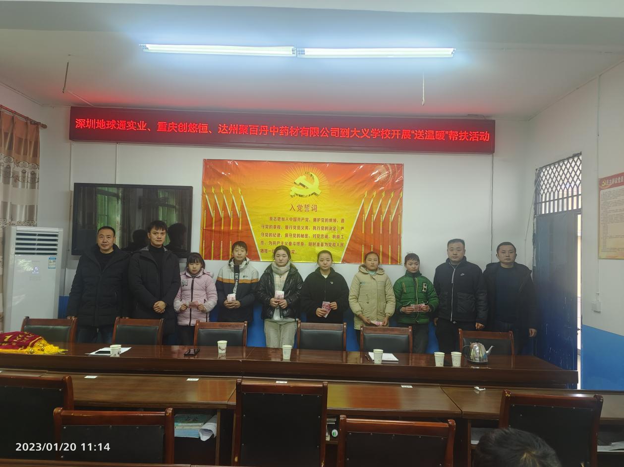1月20日,深圳地球通实业有限公司、重庆创悠恒商贸有限公司、达州聚百丹中草药材有限公司到大义学校开展春节“送温暖”慰问活动。今年已经是第二年收到三位总经理慰问金了,(从2022年5月到2022年12月,三位公司为贫困学生共捐赠物质、现金共计二万余元)学生十分感激你们伸出援助之手,让同学们学习无忧,谢谢你们。