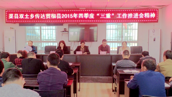 10月15日上午,双土乡传达贯彻县2015年四季度“三重”工作推进会精神,乡、村干部,乡属单位负责人,3万亩农建综合示范区建设所涉及组的组长参加会议。会议由乡长郑勇主持。