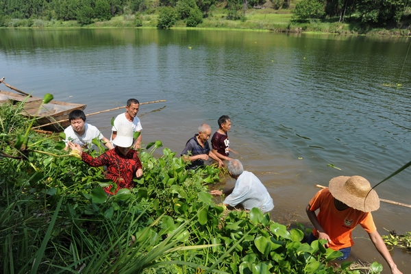 “不摆了,这些天清理水葫芦用手抱、推,耙子捞,肥水把衣服裤子都整变色了,水里的、岸边的过江藤、大铁莘草、茅草、野菱角把身上都划烂了。”8月17日下午2点在渠县静边镇永乐村1组,今年51岁,当地群众称“浪里白条”的村民李含春说。永乐村位于流江河上游西岸,在“清河护岸净水保水”行动中,每天出动干群12-14人进行水葫芦清理工作,防止其滋生蔓延、破坏水质、影响航运。