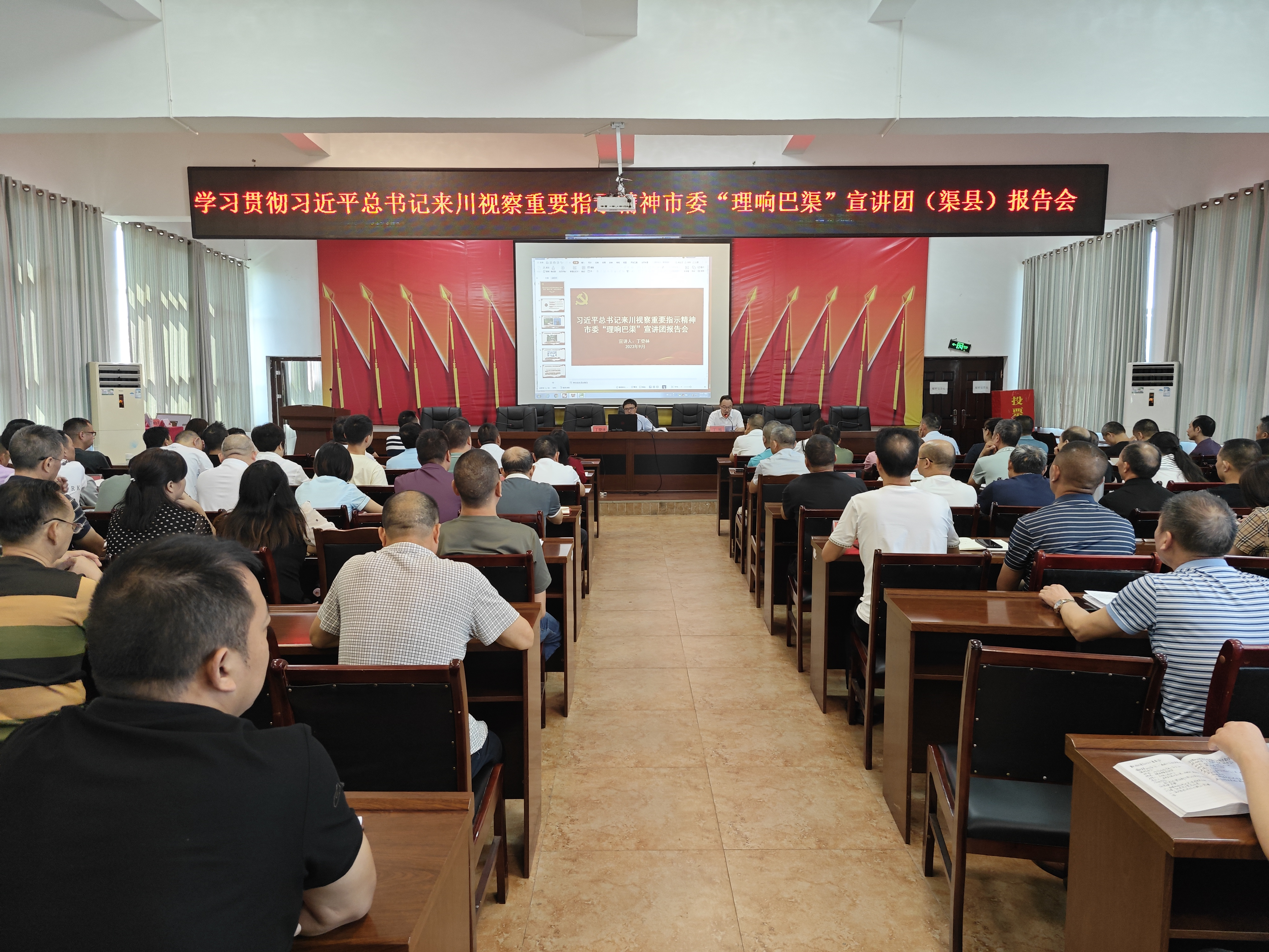 2023年9月14日,学习贯彻习近平总书记来川视察重要指示精神市委“理响巴渠”宣讲团(渠县)报告会在静边镇举行。宣讲团成员、达州市委党校经济学教研部主任、副教授丁登林作宣讲报告,静边镇党委书记丁旭主持报告会。静边镇机关干部、村(社区)书记、主任、副书记以及镇辖各单位负责人参加会议。