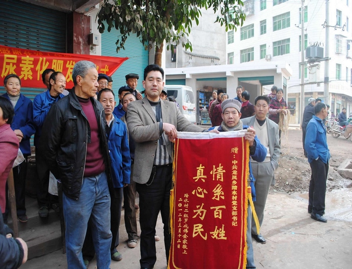 在此基础上,陈龙山带领“村支两委”一班人围绕改善和服务民生下功夫做文章,每月都要召开村组干部会、党员会、村民代表会,广泛征求各方面意见,制定民生工程计划,逐项加以实施。踏水村是一个离乡场镇较远的村庄,全村520户,2000多人,交通不便,群众怨声载道,陈龙山看在眼里,急在心里,他千方百计向在外成功征求意见函筹措资金50多万元,带领村组干部义务劳动,苦干四个多月,村民们自发燃放鞭炮,将绣有 “情系百姓,真心为民”的锦旗送到村支部。