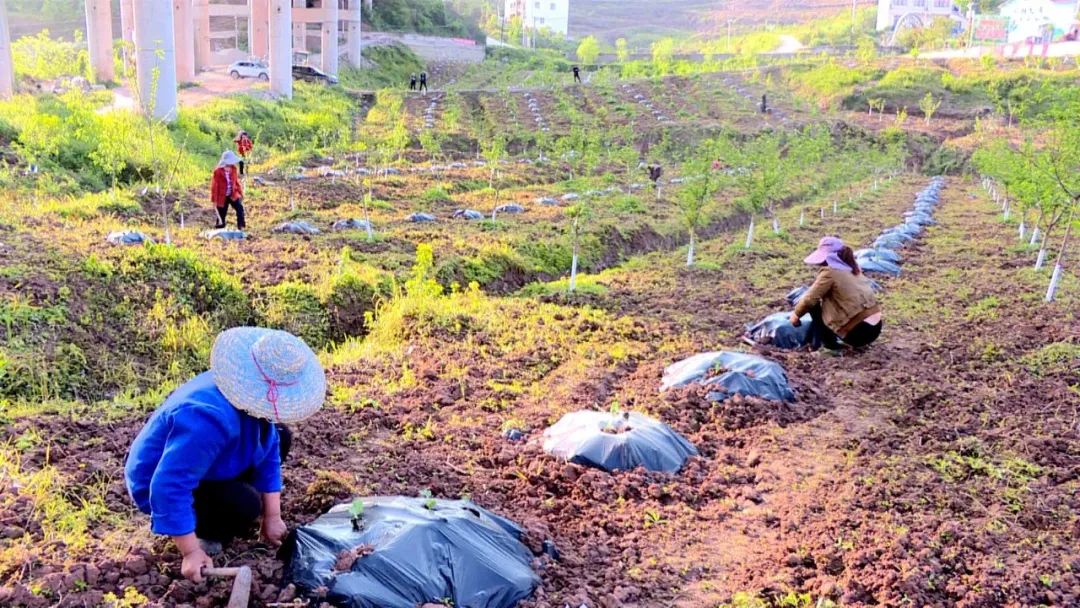 渠北镇双桥村群众 夏平全:我在我们双桥果园务工,务工主要是施肥,除草,栽苗,工资是60至120,在家门口能挣到钱,又能照顾老小。