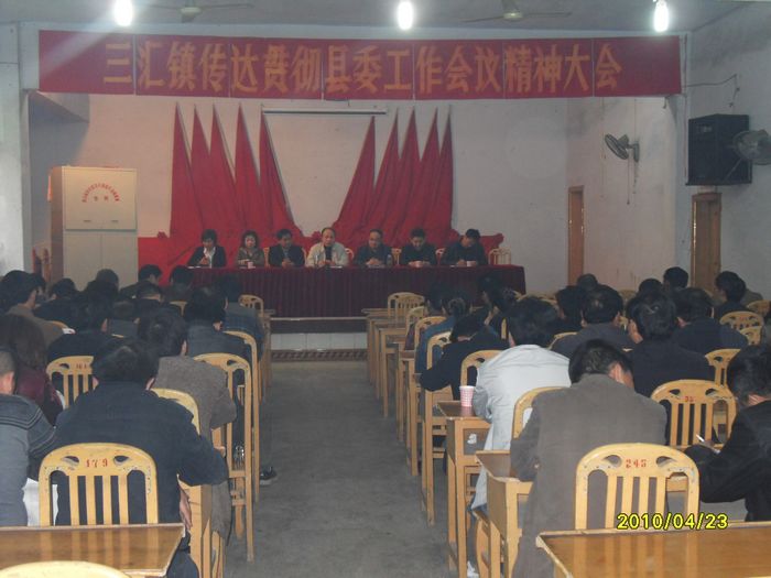 4月23日下午,三汇镇召开各村(社区)支书、主任、镇辖各单位负责人和机关全体干部职工大会。迅速传达贯彻县委工作会议精神,会议由镇委书记孙小雁主持。