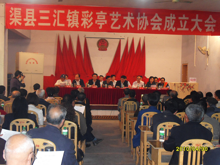 在“三汇镇彩亭艺术协会成立大会” 上,镇长王兴同志庄重地宣布了彩亭协会正式成立。大会上,中铁二十三局川东水泥有限公司董事长、总经理吕保华先生向大会致辞。县委宣传部副部长奉光成代表县委常委、宣传部长陈运英、副县长罗谦同志在会上讲了话。市人大委员、达州市工商联副主席、渠县工商联主席、渠县总商会会长、三汇籍在外成功人士刘德伟先生向大会表示了祝贺。到会祝贺的还有县文体局、企业家、社会各界知名人士出席了大会并作了发言。镇委书记孙小雁同志就“三汇彩亭协会”成立以后,对三汇彩亭未来的发展和希望作了总结讲话,提出了新的要求和任务,大会期间,有关领导向协会授牌、授印,民政局宣读了县民政局审批“三汇彩亭协会”文件,并现场为三汇镇颁发了“国家级非物质文化遗产名录”证书和传承人证书,大会在热情洋溢中圆满结束。