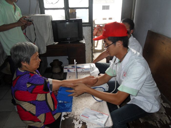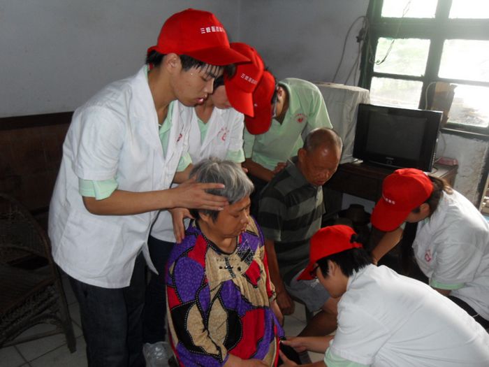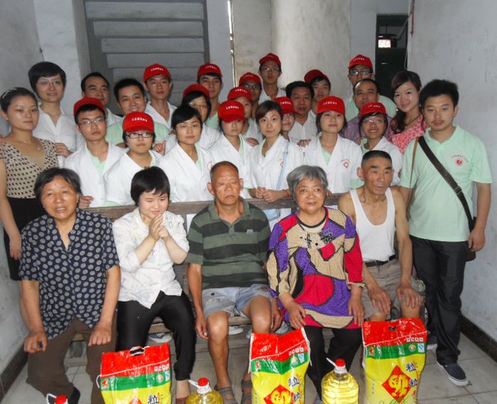 随后镇委委员、镇团委书记郑卓林带领自愿者立即冒雨前往此次活动第一站,慰问三汇镇敬老院的老人,他们为老人送去了大米、食用油以及日常生活用品,同学们打扫了敬老院的卫生,为居住的老人整理卧室,运用自己的专业知识给老人们测血压、按摩身体,询问解答他们的病情、还为一位瘫痪在床的80岁老人擦身体,老人更是感动的泪流满眶,最后同学们还集体为老人表演了文艺节目,在老人的脸上我们看到了久违的灿烂笑容,70多岁的田道英老人激动的提出想为大家唱首《唱支山歌给党听》,青年志愿者用热烈的掌声欢迎了她,田道英老人用依然嘹亮的歌声和脸上幸福的泪水表达了对党对政府、对共青团的感激。临别时,老人们紧紧握住自愿者的手,祝愿他们以后能好好学习将来报效国家报效党和人民。