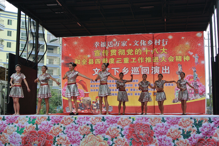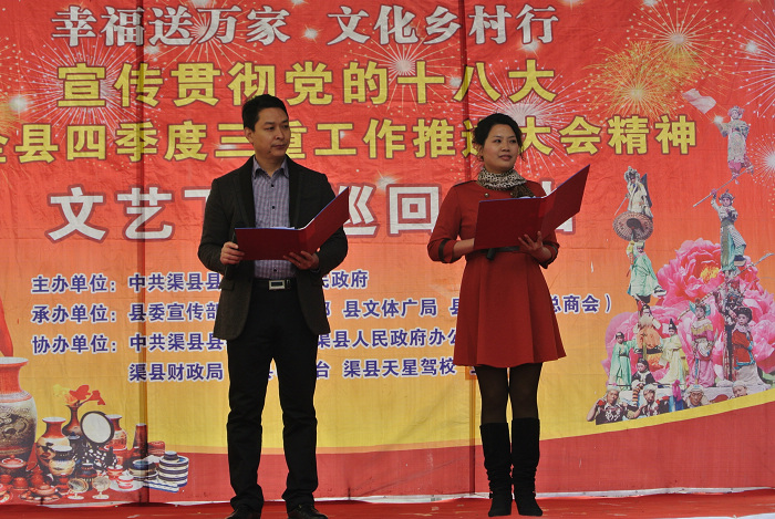 12月6日上午,阳光和煦、人声鼎沸。由中共渠县县委、渠县人民政府主办,县委宣传部、县委组织部、县文体广局、县工商联(总商会)承办的“幸福送万家 文化乡村行”宣传贯彻党的十八大暨全县四季度三重工作推进大会精神文艺下乡巡回演出在三汇镇西坪社区彩亭大道隆重举行。