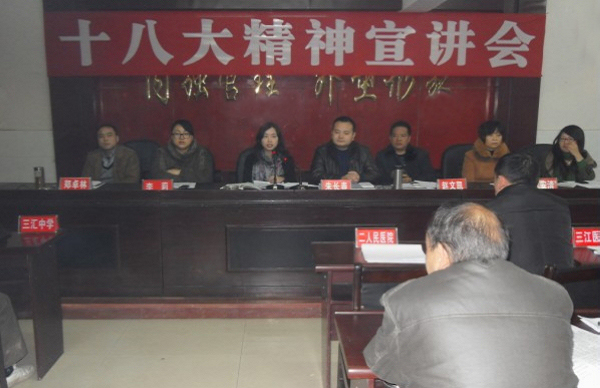 12月19日上午,县委党校王兰老师赴三汇镇就学习宣传、贯彻落实十八大精神作专题宣讲报告。镇党委副书记、镇长朱长春,镇人大主席李莉,镇党委副书记赵文凯,镇纪委书记王万太,镇党委委员张安清,副镇长郑卓林、雷虹出席会议。