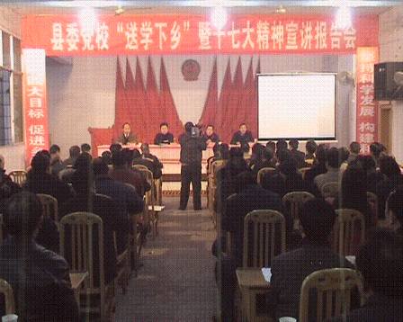 2007年12月20日,县委党校赴三汇镇举行“送学下乡”暨十七大精神宣讲报告会。会议由三汇镇委副书记、镇长杨登伦主持。三汇镇机关工作人员、企事业单位负责人、村(社区)五职干部、辖区学校负责人共204人参加了会议。