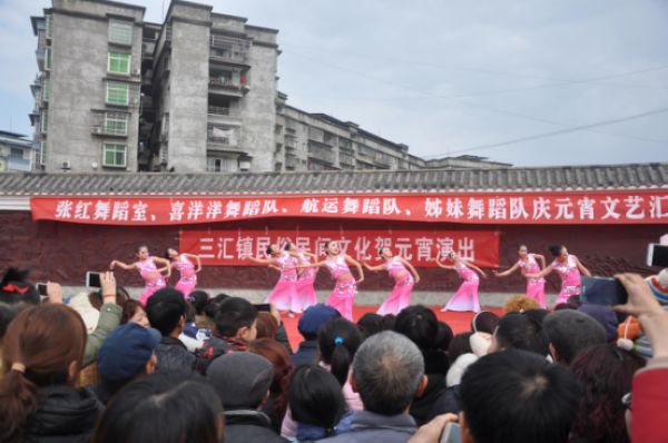 大年十五下午,由三汇镇张红舞蹈队、喜洋洋舞蹈队、航运舞蹈队、姐妹舞蹈队、老年协会等百余名演员在三汇镇汇园整队出发,揭开了元宵文艺演出的序幕。演出队伍打起锣、敲起鼓、扭起秧歌沿三汇镇河街、大井街,英民街一路向西坪新区彩亭大道行进,然后在彩亭广场集中演出。