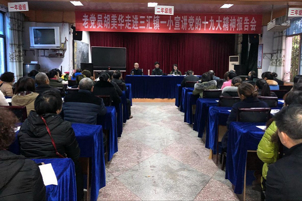 12月1日,三汇镇老党员胡美华走进三汇镇第一小学宣讲党的十九大精神。学校100余名教师、学生家长代表聆听了宣讲。