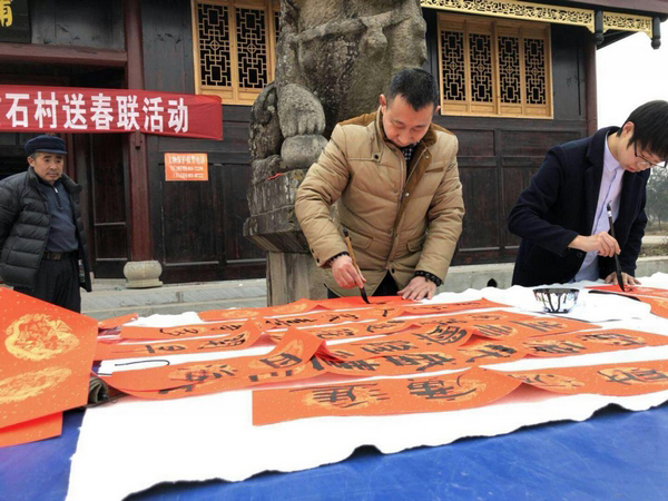 2月9日,现居住于成都的三汇籍人士、达州市书法家协会会员汪绍华,渠县书法家协会会员李强来到重石村开展现场写春联送春联活动。当天,四川省书法家协会会员、渠县三汇中学教师王锡军,重庆西南科技大学学生王小刚一起为重石村村民写下200余幅新春喜联,充分体现了汪绍华、李强、王锡军、王小刚等关爱家乡、回报桑梓的赤子之心,此举获得了重石村村民的一致点赞。(张宁 彭思诗)