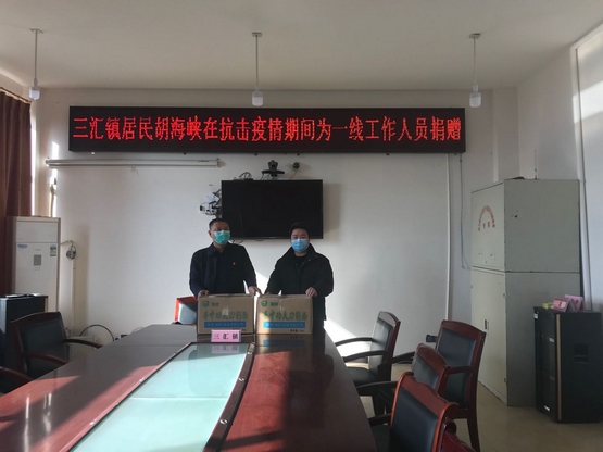 2月16日上午,三汇镇兴民社区共产党员胡海峡来到三汇镇人民政府,为镇政府捐赠医用口罩1000个,支援疫情防控一线值守的工作人员。据了解,此前他还给兴民社区捐赠了800个医用口罩。