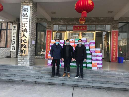 在渠经销叮当牛系列产品的渠县梓辰商贸公司总经理王小亮为三汇镇捐赠100件,价值6000元人民币的纯澳燕麦乳,支持慰问三汇镇坚守在一线的疫情防控工作人员。三汇镇兴民社区普通党员胡海峡捐赠1800个医用口罩支持疫情防控工作。三汇镇经营世纪华联超市的浙江籍老总严卫明捐赠了52箱方便面,20件矿泉水,体现了民营企业在关键时刻的社会担当。