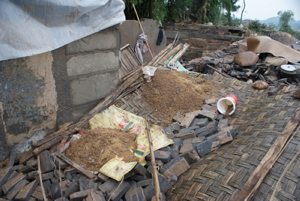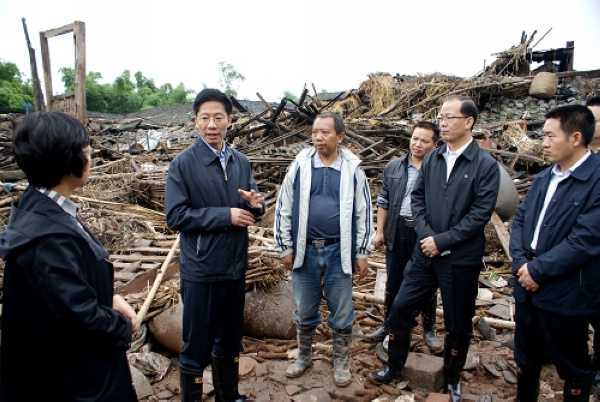 副省长钟勉(左二)、市委书记焦伟侠(右二)、县委书记王善平(右一)、县长苟小莉(左一)视察谭坝村三房营灾情