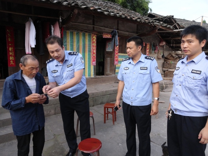 这时,一位腿脚不便的老太婆拄着拐杖带着草帽颤巍巍地走来,由于上了年纪,她一边走一边呼哧呼哧地喘着气。这时,驻村民警叶华典赶紧跑上去,搀着她来到了院坝,端了一张凳子过来,扶她坐下,然后在院里泡了一杯茶递上来。等她歇过来气,喝完一杯水以后,扶她到指定位置处坐下,并为她摘下草帽,整理好衣服,户籍民警吴佳伦拿起相机帮她照出一张好看的相片用于办农保。